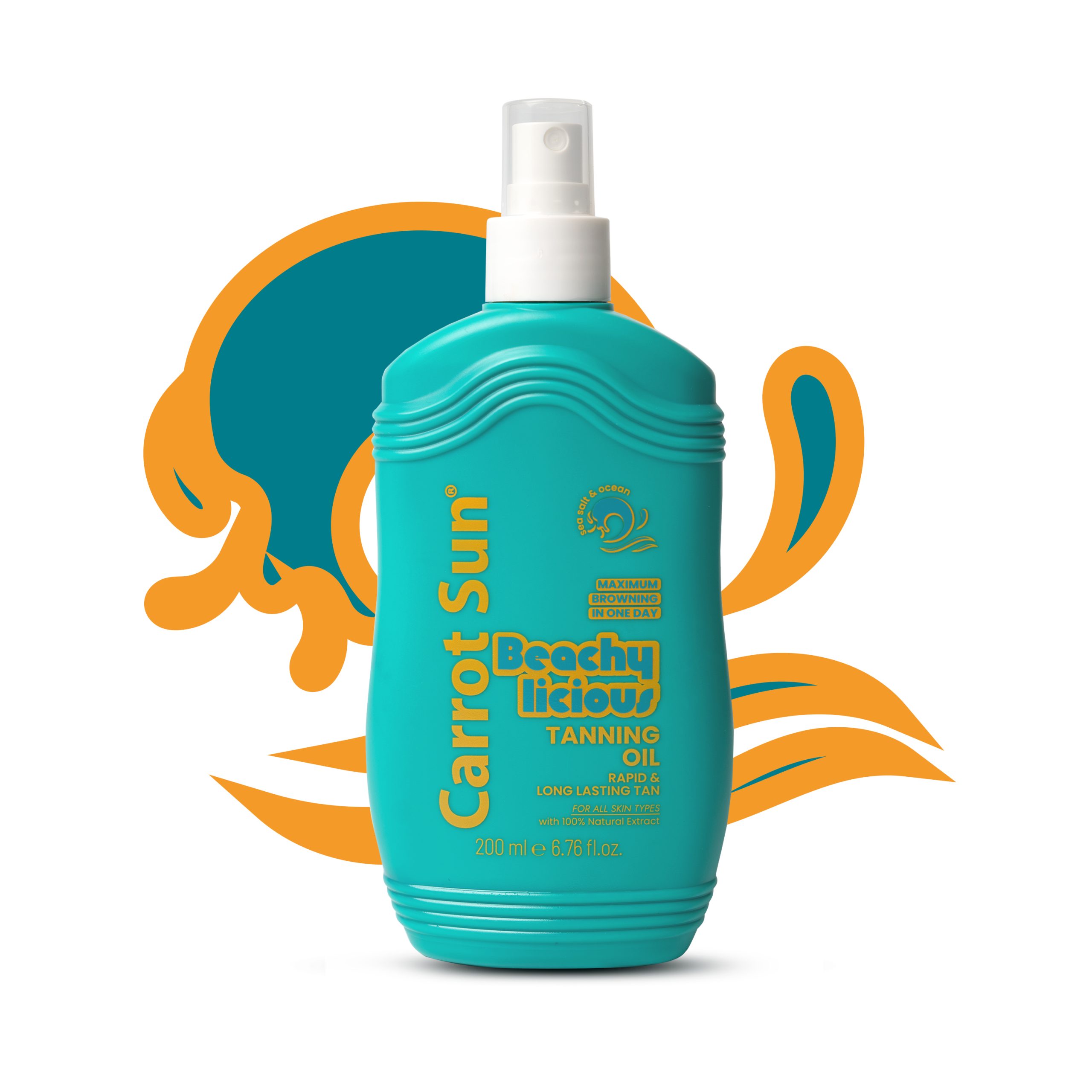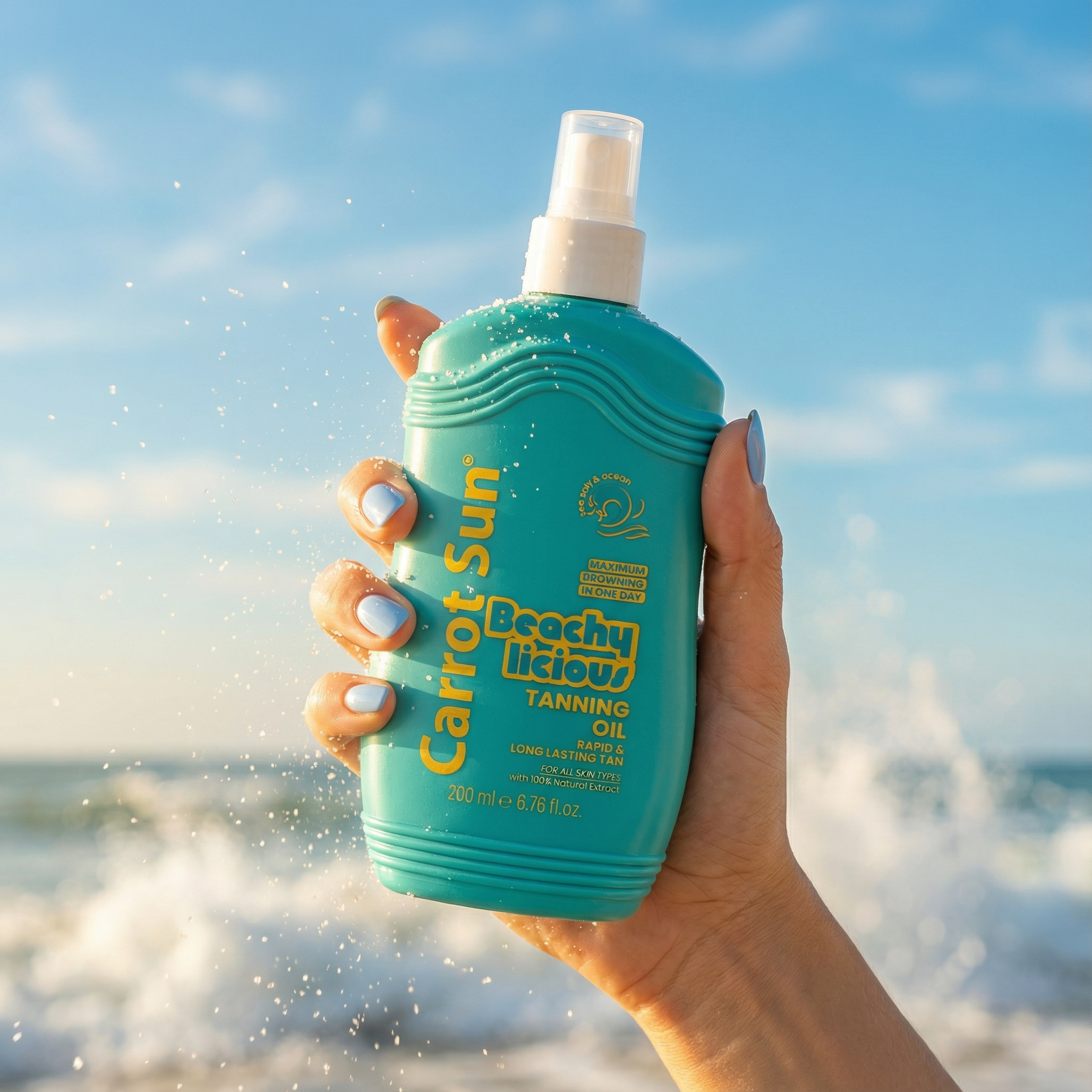 Introducing Beachylicious, Carrot Sun’s invigorating Ocean & Sea Salt tanning oil, crafted to give you a fast, deep, and long-lasting tan while evoking the fresh, energizing scent of the sea. Perfect for beach lovers who want a hydrated, radiant tan with a cool ocean vibe.